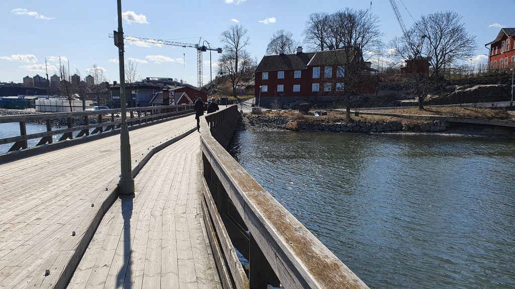 There’s one bridge in Djurgården that doesn’t connect to the mainland, Beckholmsbron (crossed 4.4.2020). It connects to Beckholmen. Beckholmen is a very small island, most likely unknown to almost everybody. But for a runner, the island is worth visiting (even if not collecting bridges…) since there’s a hill and from the top of the hill there’s a nice view over the city. Remember, the coastline of Djurgården itself is flat, so this hill gives some boost for otherwise monotonic running. The bridge itself has a wooden surface, which I guess is pretty rare.