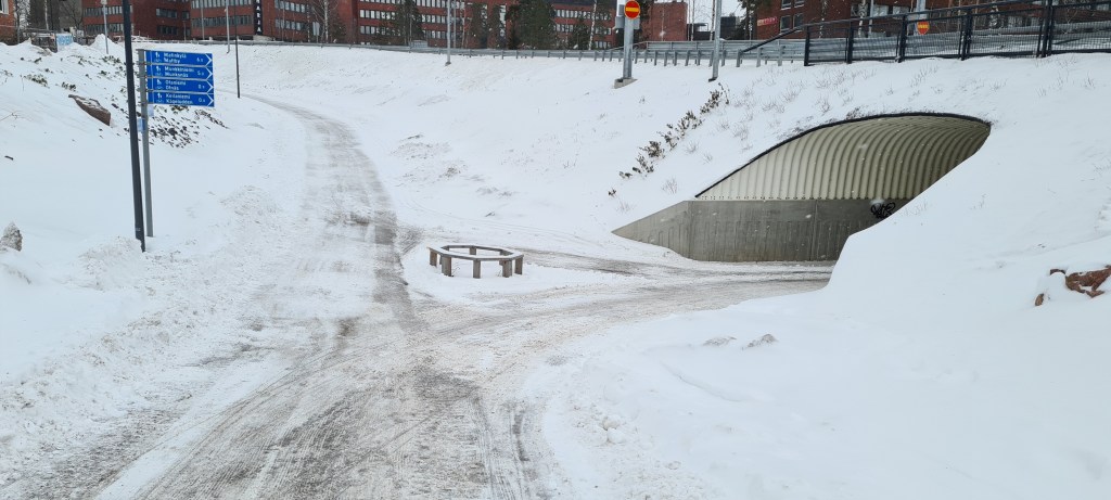 Tällaisena lumisena talvena tuollainen matala huomaamattoman värinen aitaus on erityisen ongelmallinen. Ensinnäkin hämärässä sitä ei välttämättä ole helppo havaita. Toiseksi olen aivan varma (ei kuvatodistetta), että hetkittäin se on hautautunut lumen alle. Kuvittalepa fillaroivasi keskellä pyörätietä lumivallin läpi ja alla onkin tuollainen ylläri.