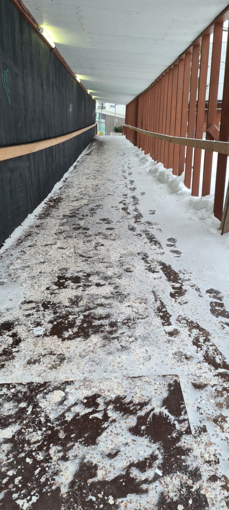 Tämä kuva kertoo jo omaa kieltään. Kumman valitsisit – lumesta ja loskasta vapaan asfaltoidun tien vai lumisen ja jäisen vanerisen putken?