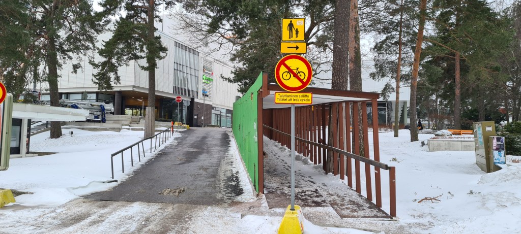 Putkeen mentäessä alhaalta päin, on edessä heti ensimmäisenä n. 10 senttiä korkea koroke. Kumman valitset – tien jossa ei ole korokkeita vai putken, jossa on (turha) koroke? Entäpä, jos olet liikkeelle fillarilla ja vaikka lapsi istuimessa? Onko todennäköistä, että hyppäät fillarin selästä pois ja työnnät fillarin kynnyksen yli liukkaaseen putkeen? Vai valitsetko kenties auratun tien?